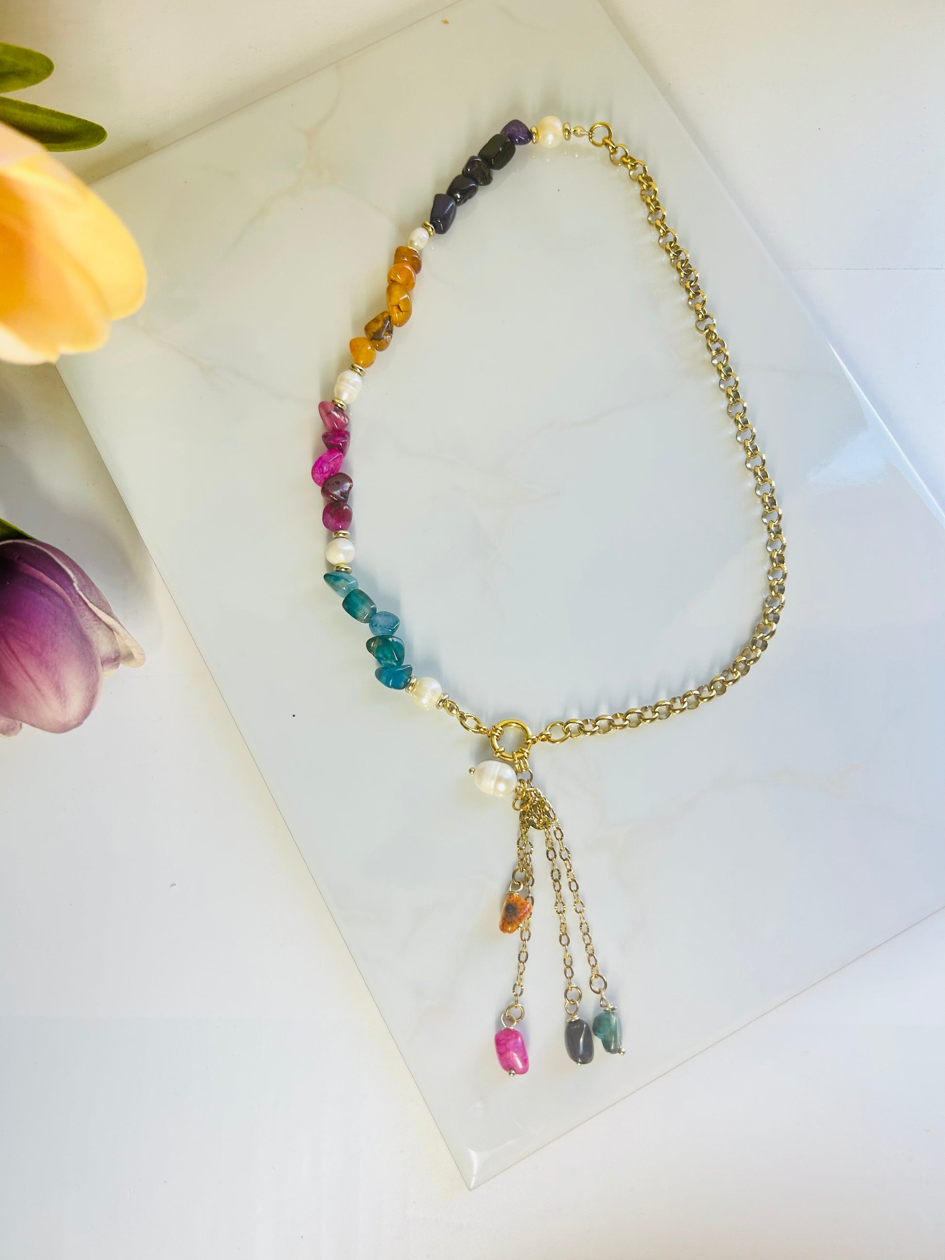 El collar Color Link combina la fuerza del ágata natural multicolor, la frescura de las perlas y el estilo contemporáneo de la cadena en stainless steel.
