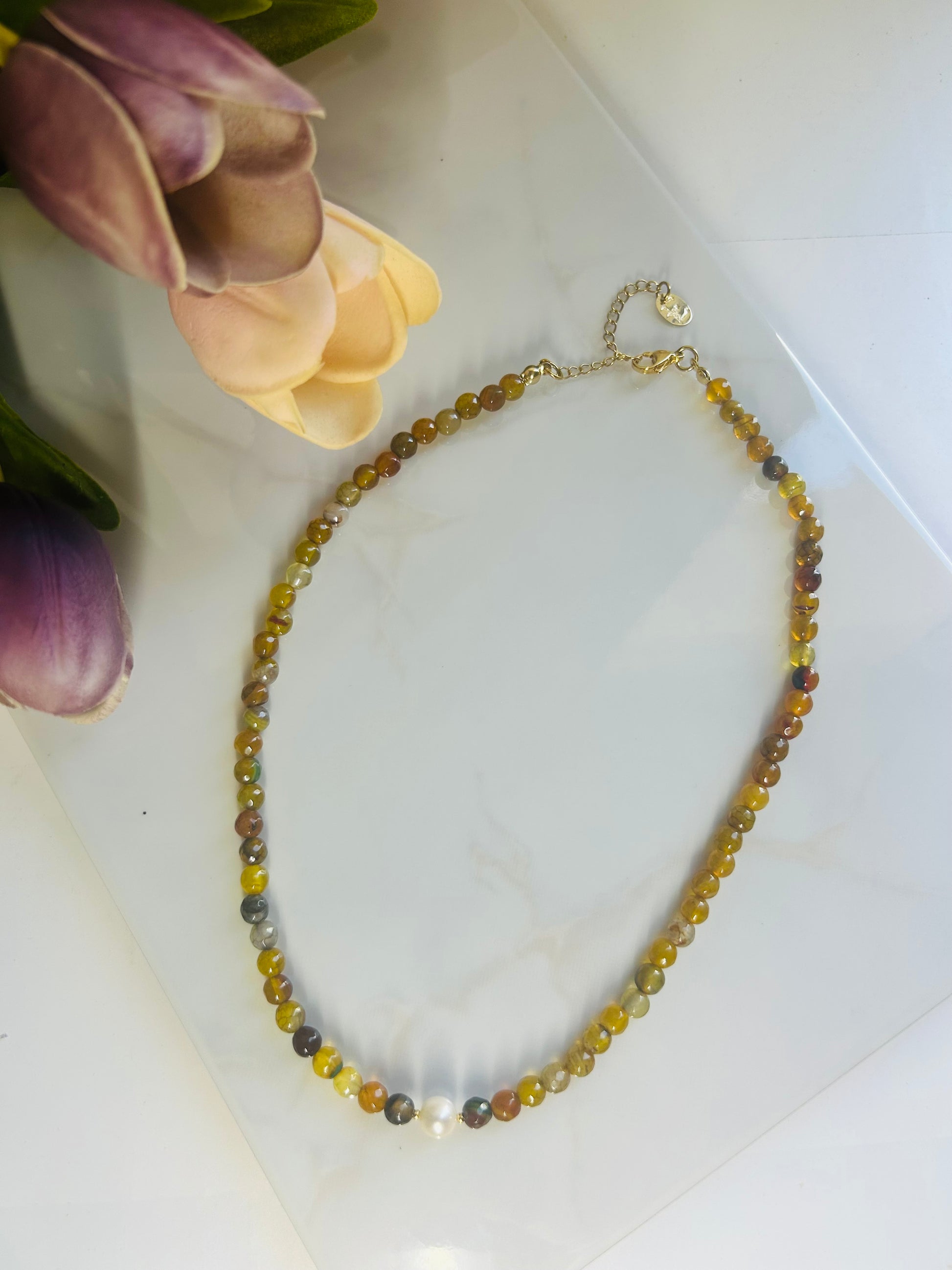 El collar Golden Earth está elaborado con cuentas en tonos amarillos, miel y tierra, resaltadas con el brillo elegante de una perla natural al centro.