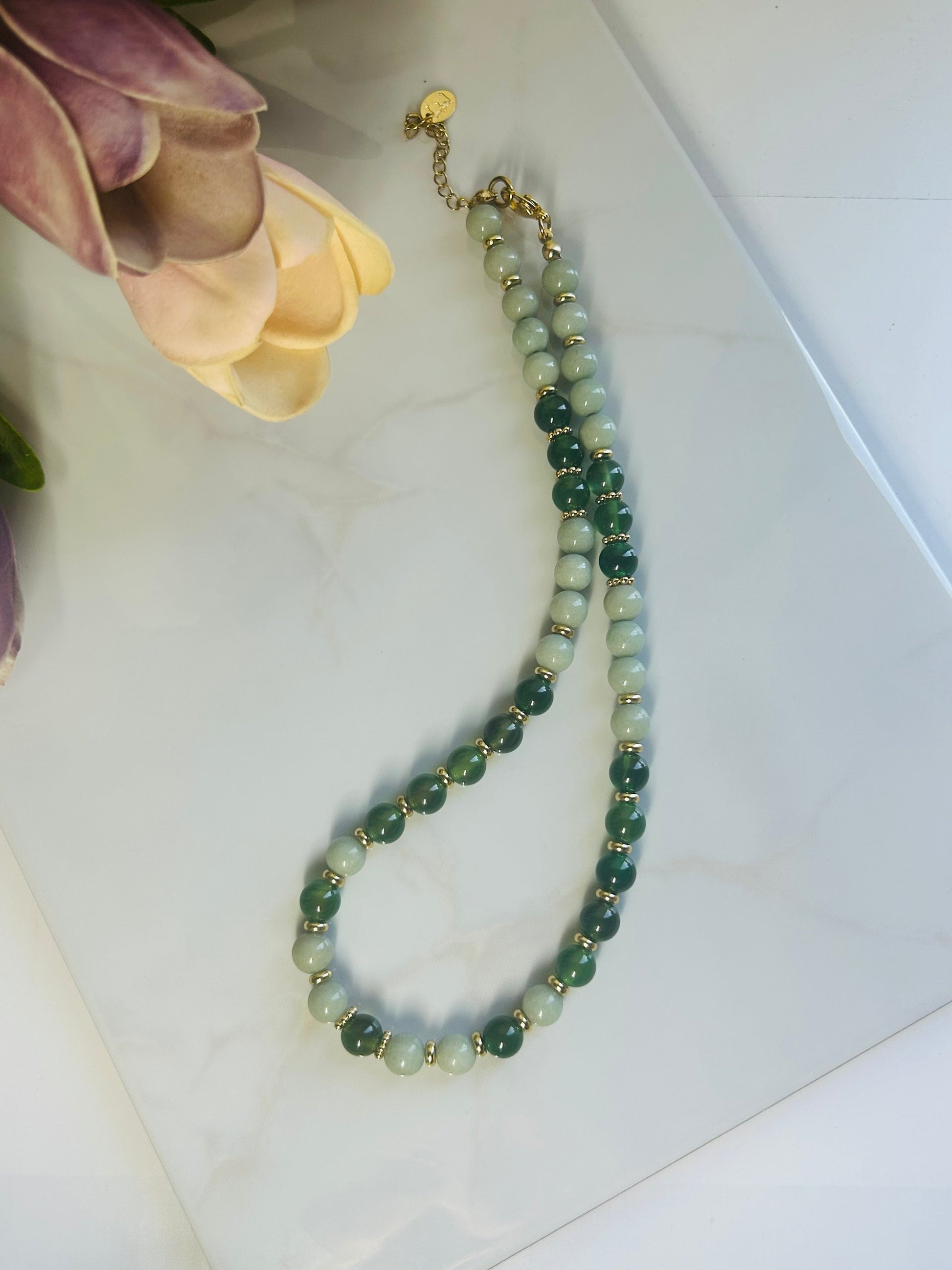 El collar Green Harmony combina jade en dos tonalidades de verde, resaltadas con delicados detalles dorados.