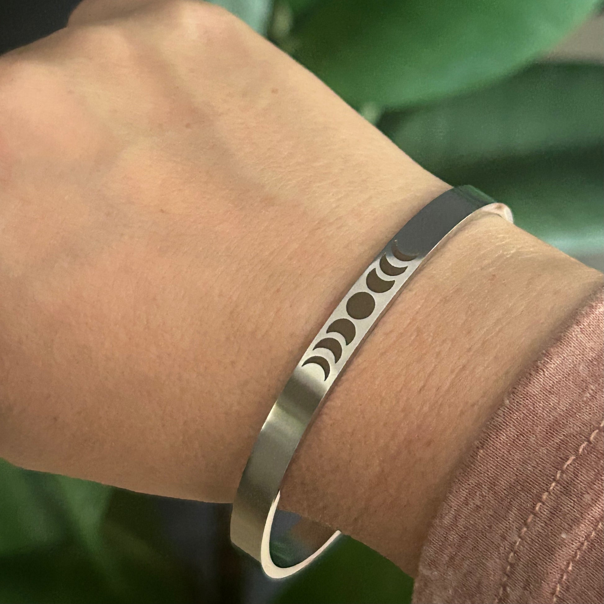 Un diseño que conecta con la energía del universo. El Lunar Phases Cuff está elaborado en acero inoxidable 304 no tarnish, lo que garantiza resistencia, durabilidad y brillo permanente.