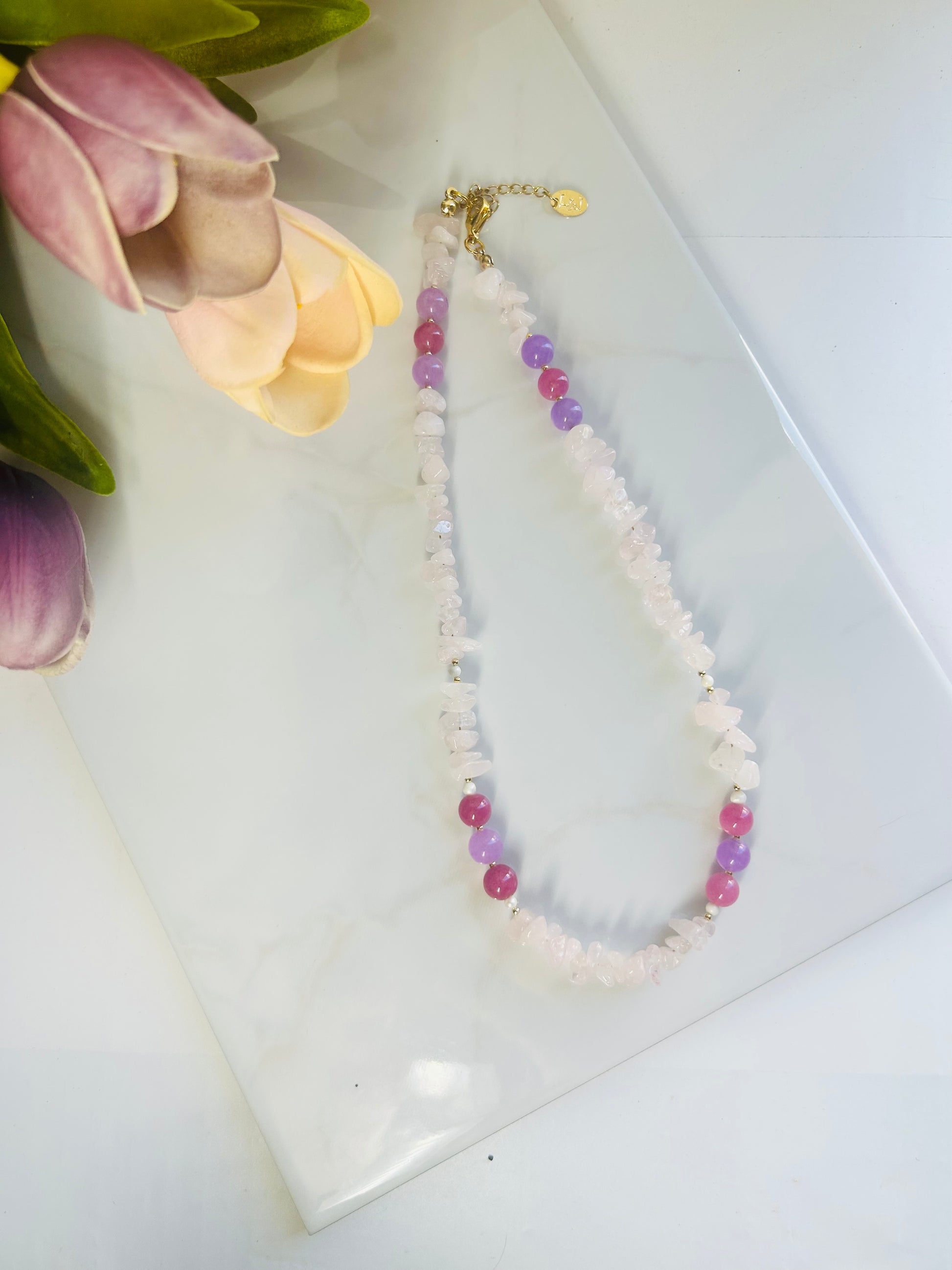 El collar Pink Aura está elaborado con chips de cuarzo rosa, combinados con cuentas en tonos lilas y rosados que realzan su frescura y estilo moderno.