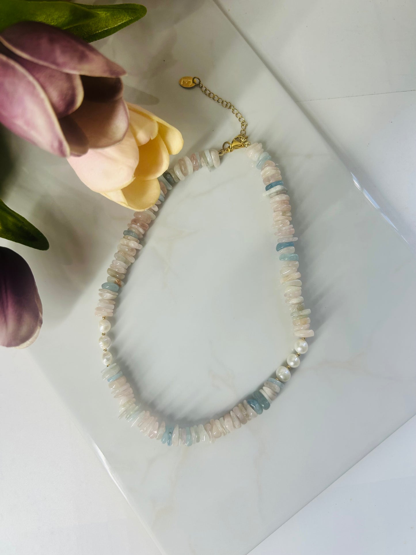 El collar Soft Bloom está elaborado con piedras naturales en tonos pastel y detalles de perlas, logrando una armonía de frescura y delicadeza.
