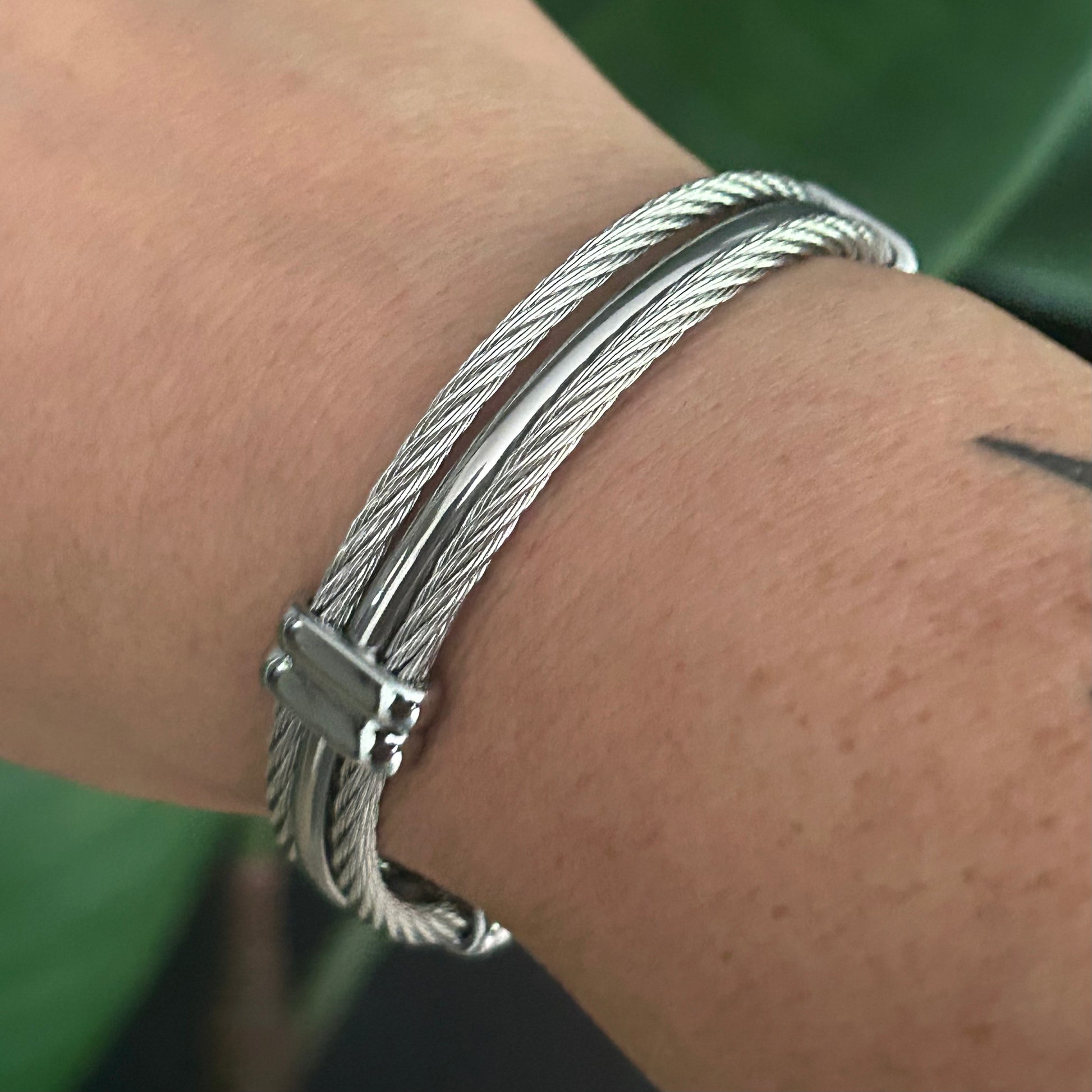 Su estilo cuff ajustable la hace práctica y cómoda, mientras que el acabado en acero natural aporta un look urbano, minimalista y atemporal. Además, es resistente al deslustre (tarnish resistant), ideal para acompañarte en el día a día sin perder brillo ni estilo.