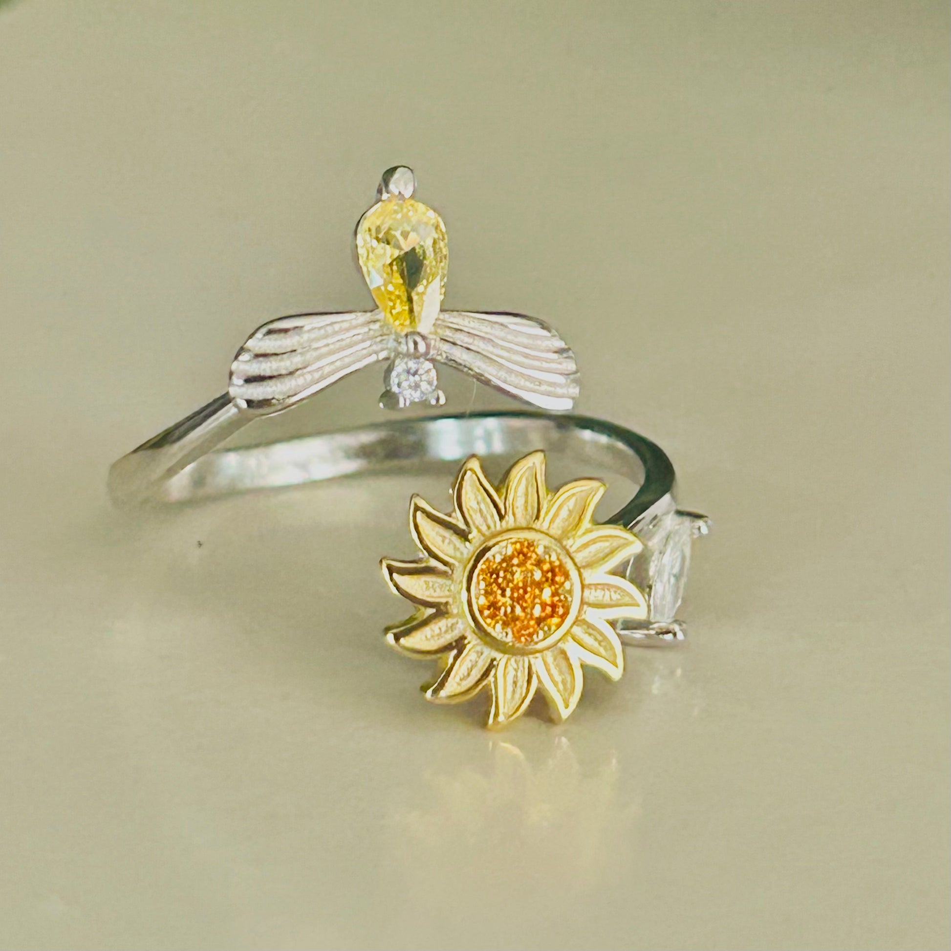 La sortija SunBee Harmony une dos símbolos llenos de energía: un girasol brillante como el sol y una abeja elegante, trabajadora y sutil.