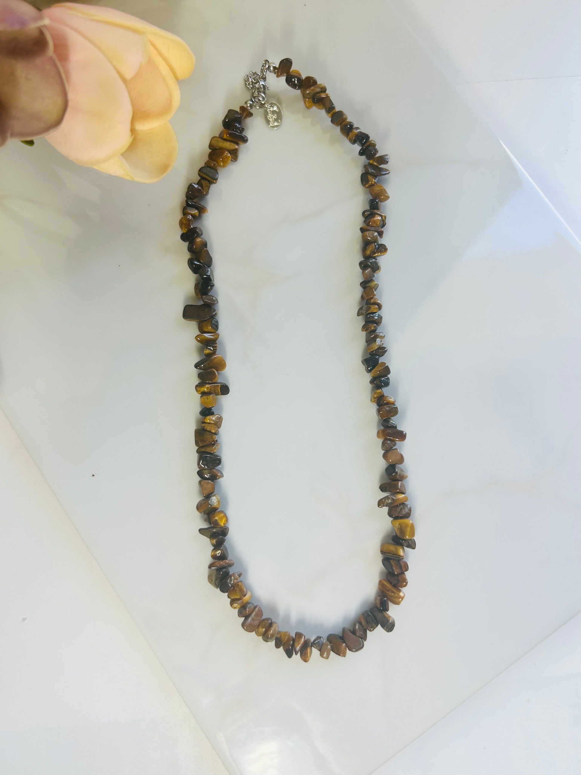 Cada piedra refleja tonos dorados y marrones únicos, creando un diseño artesanal que conecta con la tierra y resalta en cualquier outfit.