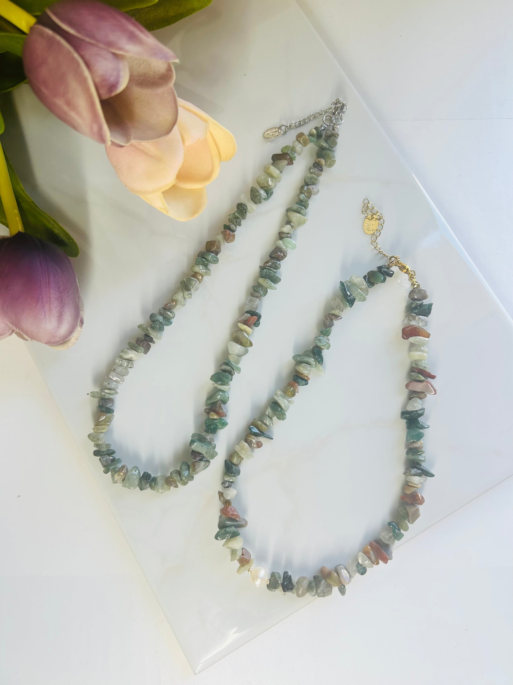 El collar Wild Green está elaborado con chips de piedras naturales en tonos verdes, marrones y neutros, creando un diseño fresco, artesanal y único.